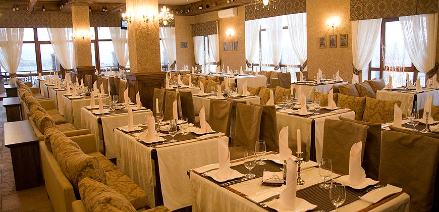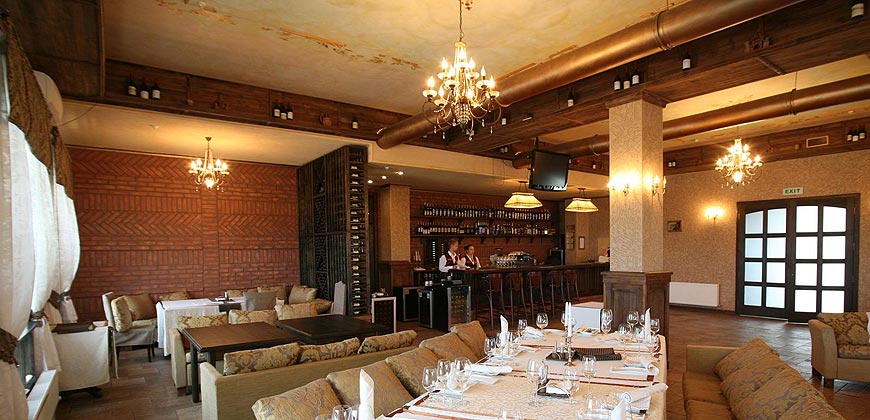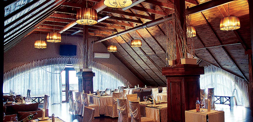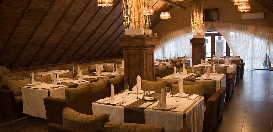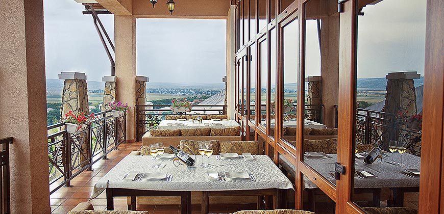 С первого этажа ресторана, с летней террасы открывается прекрасный вид на долину реки Реут и на Оргеев. Банкетный зал позволит организовать фуршет на 250 персон. А комфортная мансарда декорированная в современном стиле позволит насладиться изысками ресторана 84 персонам. Открытый балкон подарит блаженство вечернего отдыха на свежем воздухе. Уютно устроившись в кресле-качалке, вы поистине будете наслаждаться великолепным вкусом вина и потрясающим закатом солнца.